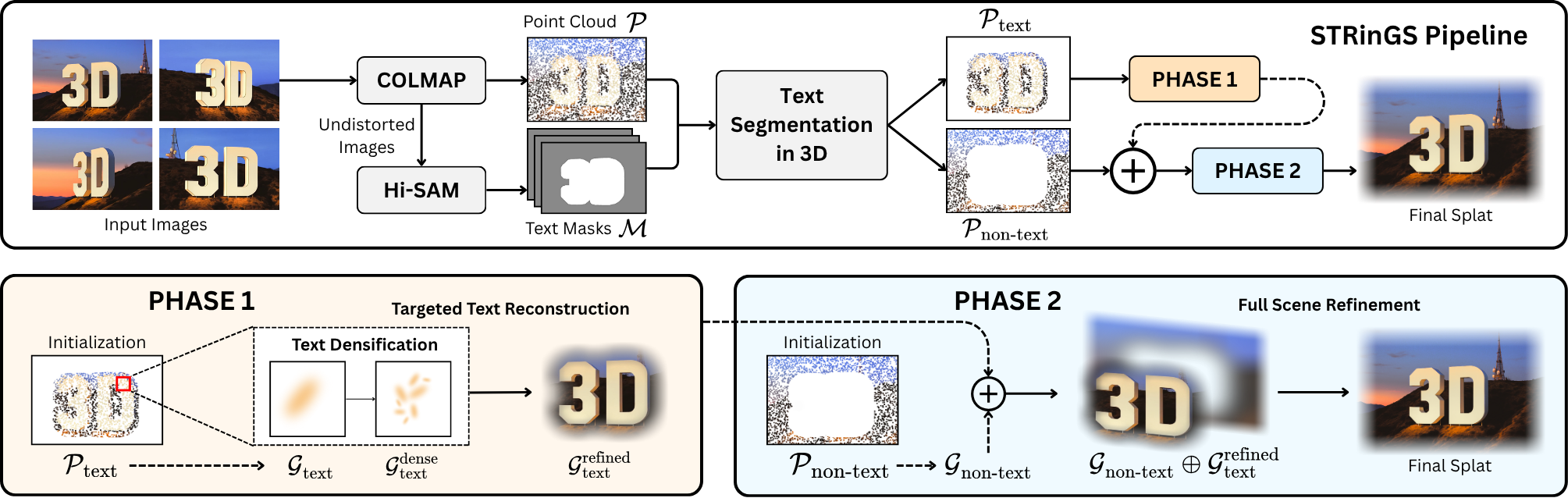 Text as signs, labels, or instructions is a critical element of real-world scenes as they can convey important contextual information. 3D representations such as 3D Gaussian Splatting (3DGS) struggle to preserve fine-grained text details, while achieving high visual fidelity. Small errors in textual element reconstruction can lead to significant semantic loss. We propose STRinGS, a text-aware, selective refinement framework to address this issue for 3DGS reconstruction. Our method treats text and non-text regions separately, refining text regions first and merging them with non-text regions later for full-scene optimization. STRinGS produces sharp, readable text even in challenging configurations. We introduce a text readability measure OCR Character Error Rate (CER) to evaluate the efficacy on text regions. STRinGS results in a 63.6% relative improvement over 3DGS at just 7K iterations. We also introduce a curated dataset STRinGS-360 with diverse text scenarios to evaluate text readability in 3D reconstruction. Our method and dataset together push the boundaries of 3D scene understanding in text-rich environments, paving the way for more robust text-aware reconstruction methods.